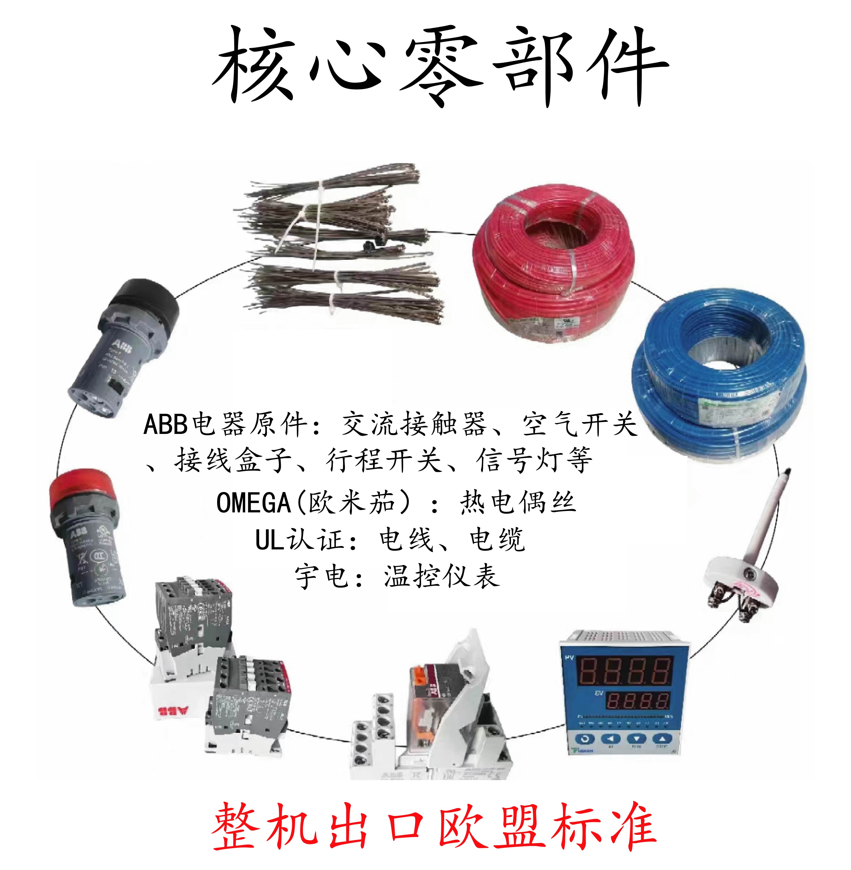 認證標準及核心零部件 | ?整機核心部件均符合CE、UL、MET等認證標準;核心零部件有ABB電器元件,UL認證電線、電纜,歐米茄,宇電、歐陸儀表等。 |